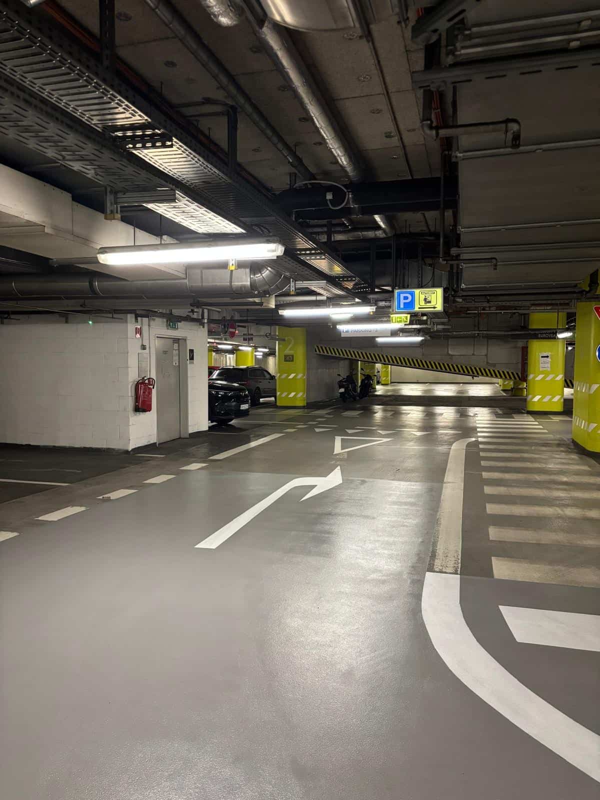 Kromě funkčních parametrů dbáme také na estetiku – barevné členění, dopravní značení i úpravy sloupů, které zvyšují přehlednost a bezpečnost v celém objektu.